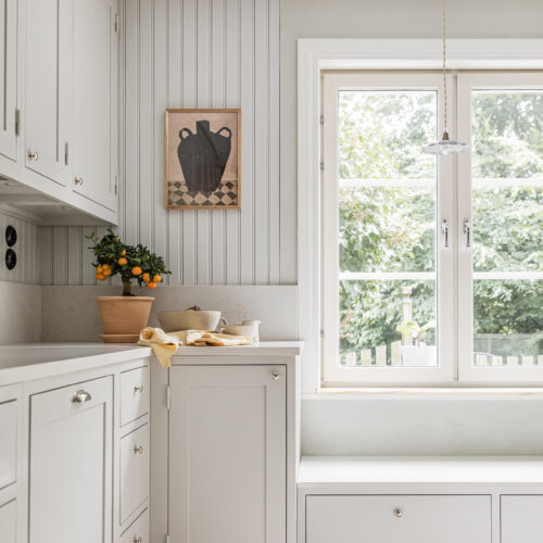 I Skånska Vellinge finns detta underbara shakerkök i en ljusgrå ton, “Dimgrå” som nyansen kallas. Pärlsponten är målad…